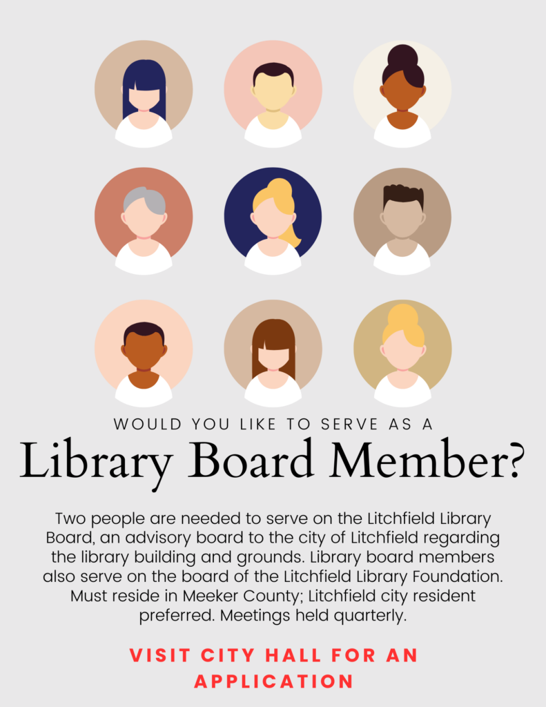 Would you like to volunteer your time to help your local library? Two people are needed to fill open spots on the Litchfield Library Board. This is an advisory board to the city of Litchfield regarding the library building, grounds, and furnishings. Library board members also serve on the board of the Litchfield Library Foundation, a 501(c)(3) nonprofit that receives and manages donated funds. Must reside in Meeker County; Litchfield city resident preferred as the majority of members must be city residents. Meetings held quarterly on the 4th Tuesdays of January, April, July, and October at 5:30 p.m. The board typically holds another meeting in the spring to survey the condition of the building.