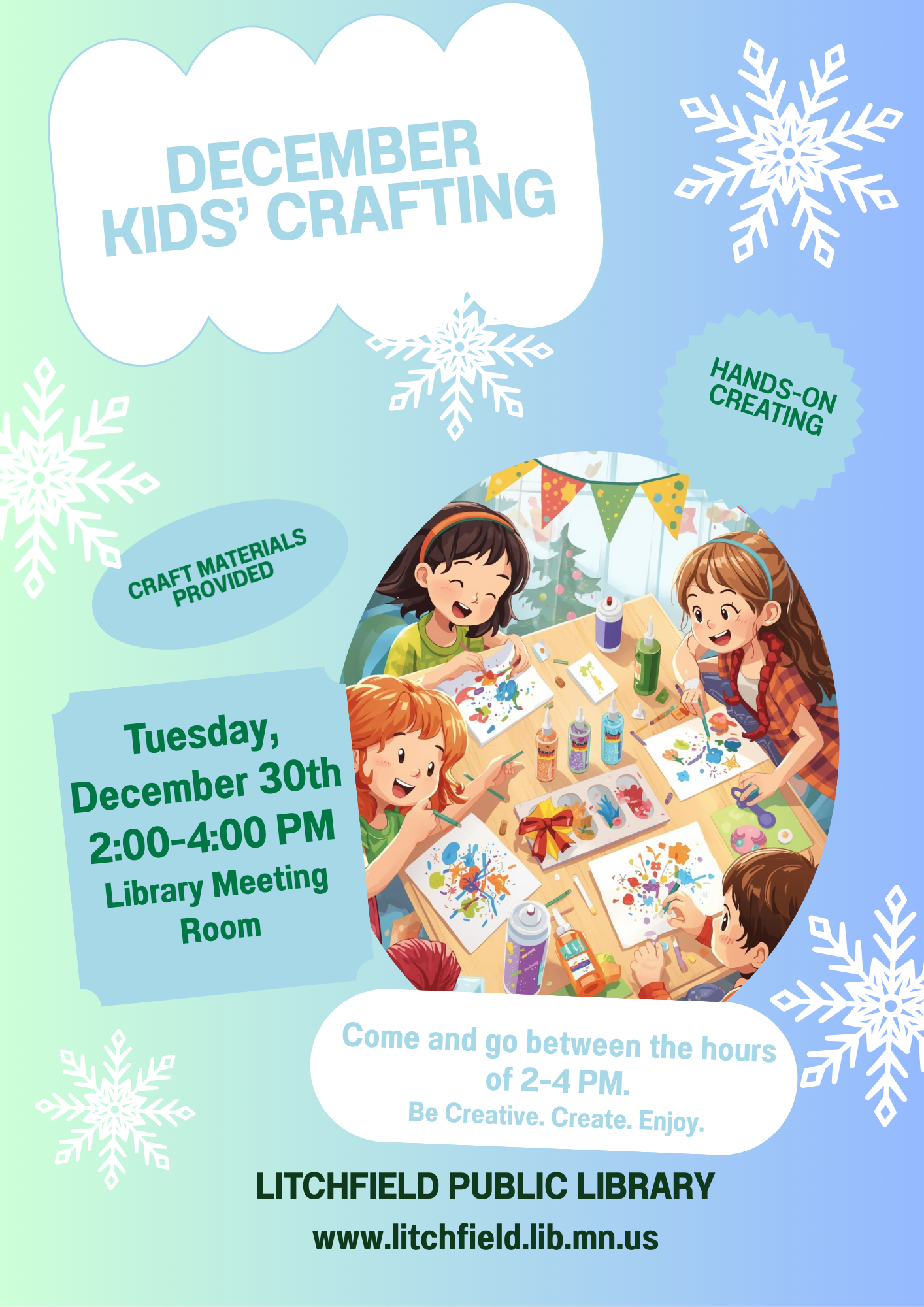 Kids are invited to the library on Tuesday, December 30th to enjoy some creative crafting. We will be bringing out our craft supplies, and youth are invited to come and create whatever they desire using the materials provided. This program is geared for kids in grades K-4th, however siblings are always welcome. Those 8 and under must have an adult/teen caregiver along.