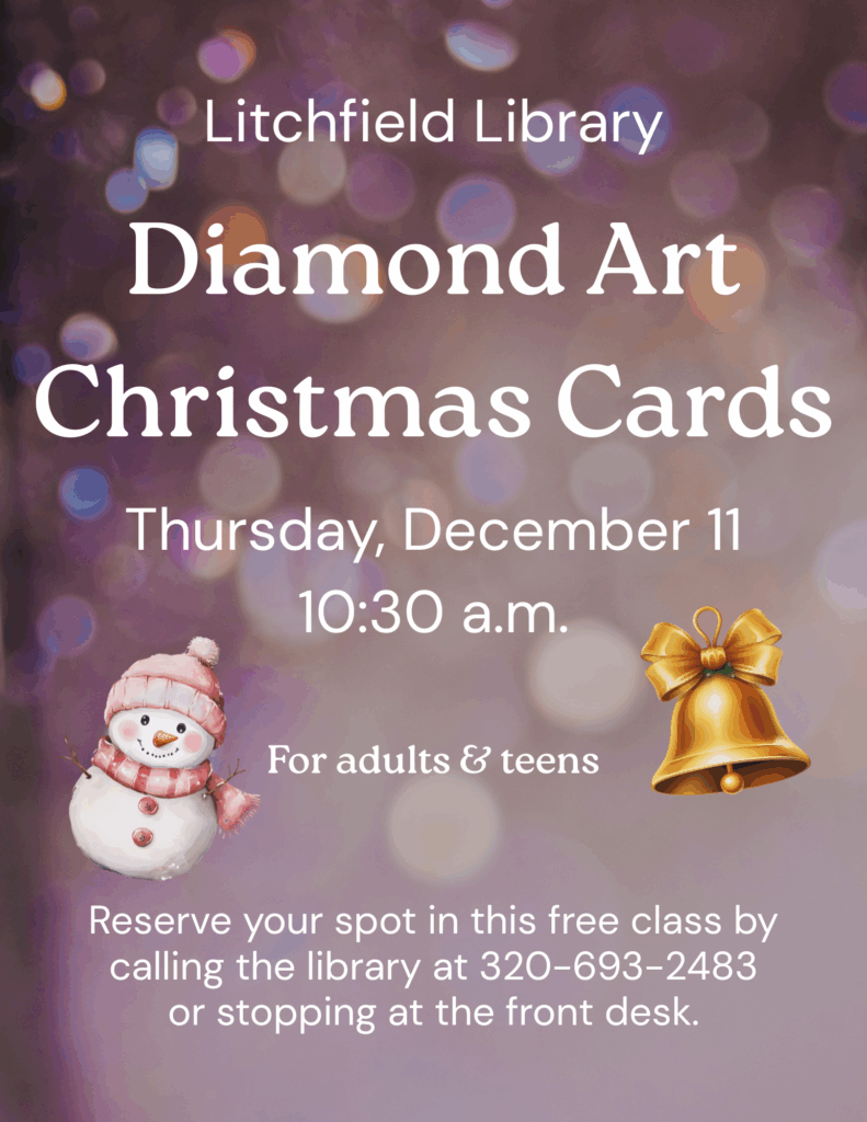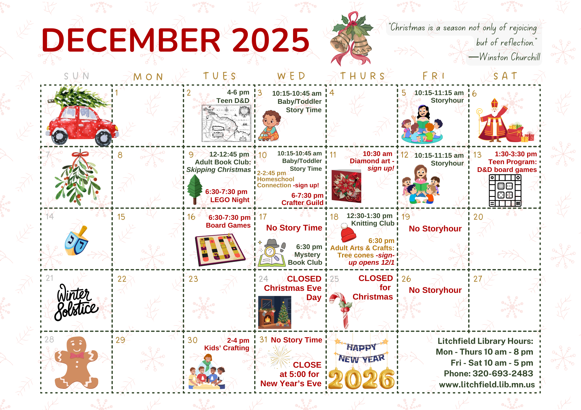 The Friends of the Litchfield Library are low on storage space for book donations. In December, please call ahead if you have more than 2 boxes or bags to bring: 320-693-2483. Thank you.