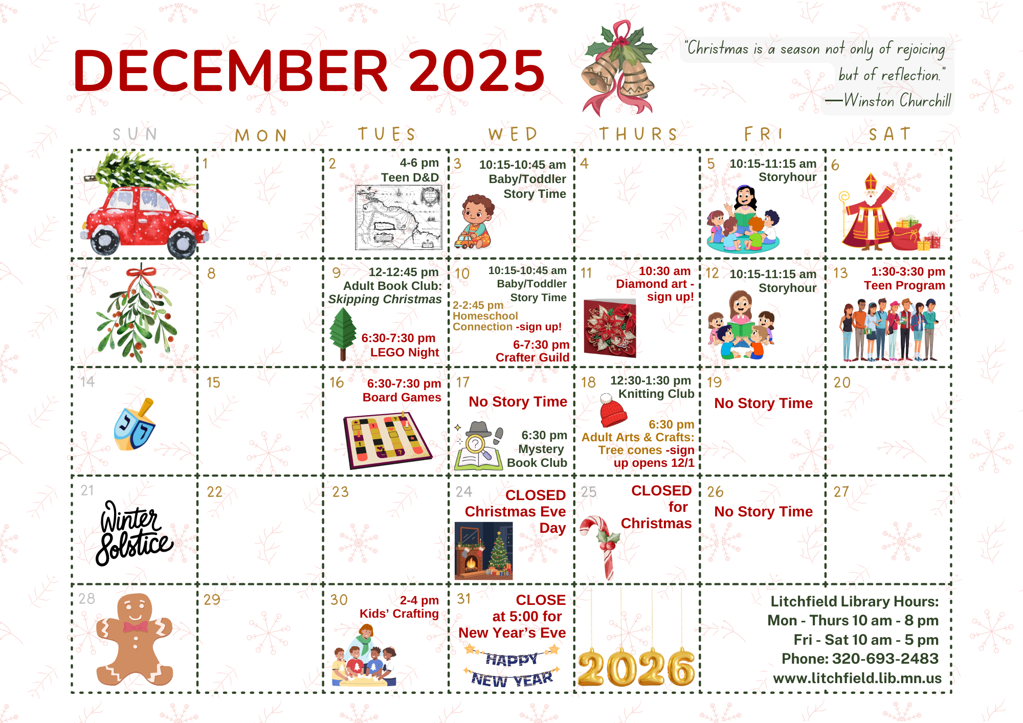 The Litchfield Library is unable to take book donations until December 1, since our storage areas are full. In December, please call ahead if you have more than 2 boxes or bags to bring. Thank you.