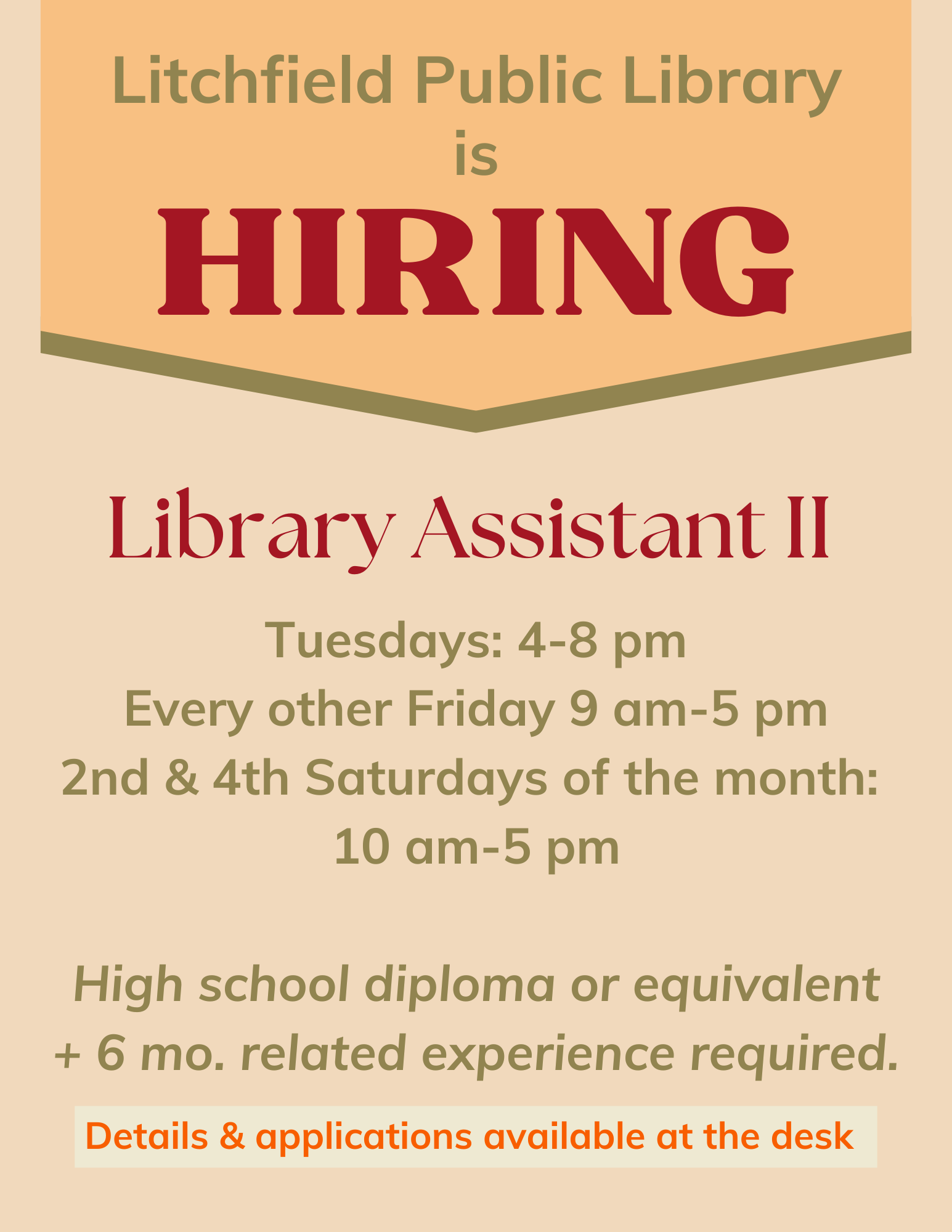 Litchfield Library has a job opening for a Library Assistant II. The hours are Tuesdays 4-8 p.m., every other Friday 9 a.m.-5 p.m., and the 2nd and 4th Saturdays of each month 10 a.m.-5 p.m.