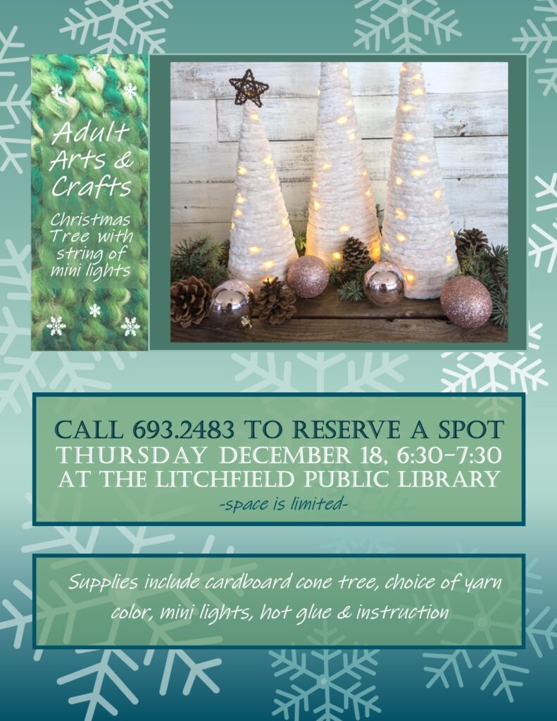 Call the library at 320-693-2483 to sign up for December’s Adult Arts & Crafts program! This month’s program will be held a week early since the library will be closed on the 4th Thursday of the month for Christmas: Thursday, December 18, 6:30-7:30 p.m. This month’s project will be cone trees with lights. All supplies are provided for this free program, but space is very limited.