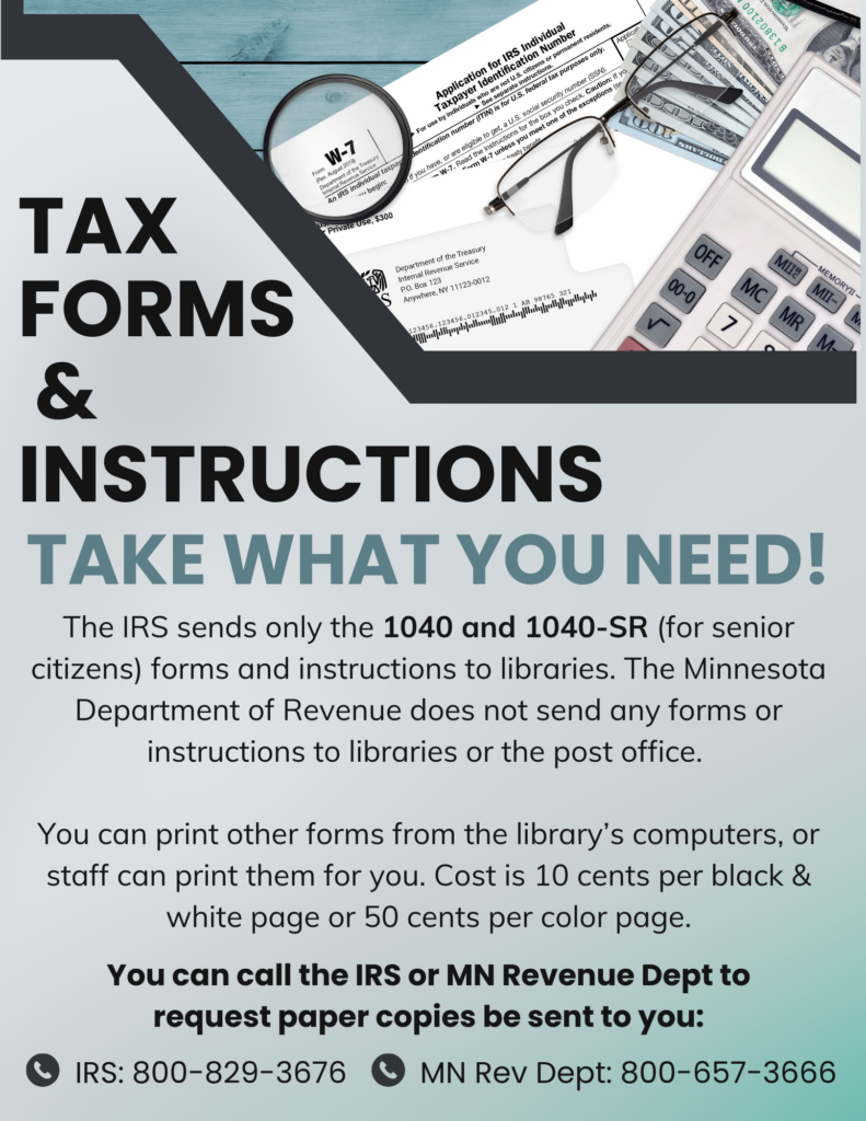 Basic federal tax forms and instructions are available on a table in the library’s entryway: 1040 and 1040-SR forms and instructions, plus 1040 and 1040-SR forms in Spanish. The Minnesota Revenue Department does not send the libraries any state forms. If you need a form that’s not available on the table, talk to a staff member for help printing what you need, or for a phone number to call the IRS or Minnesota Revenue so that they can mail you paper forms. Printouts cost 10 cents per page. Library staff cannot give any tax advice.