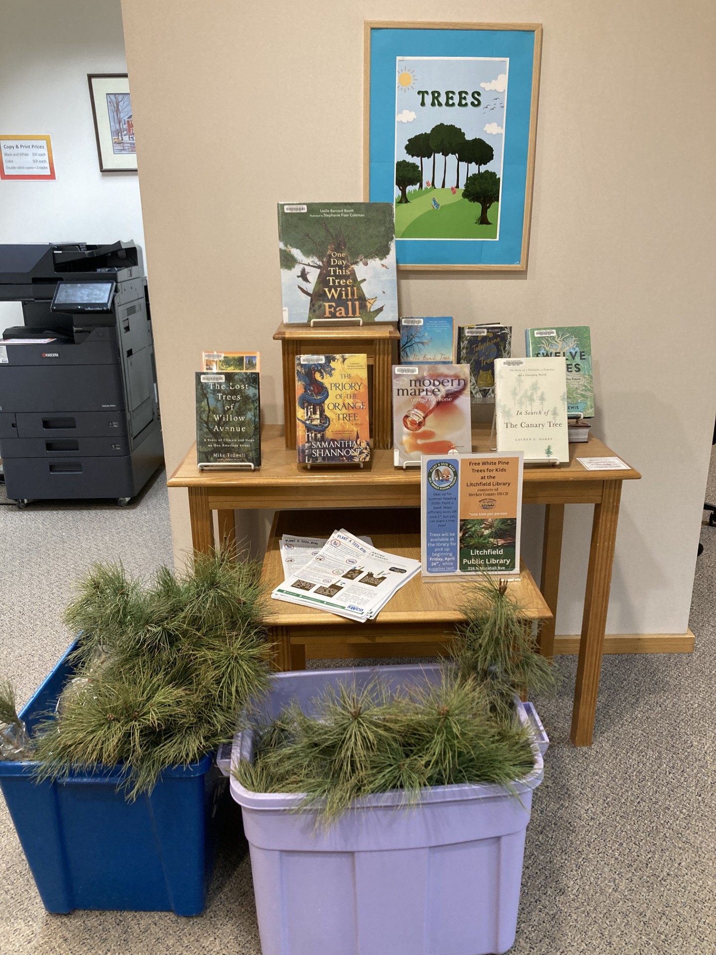 We have a preview of the summer reading program, Plant a Seed, Read – with trees! On Arbor Day, Friday, April 24, the Litchfield Library will offer free trees for kids! White pine saplings will be available to pick up beginning at story hour that morning and while supplies last, courtesy of the Meeker County Soil & Water District. One tree per child. Plan to plant them within a week.