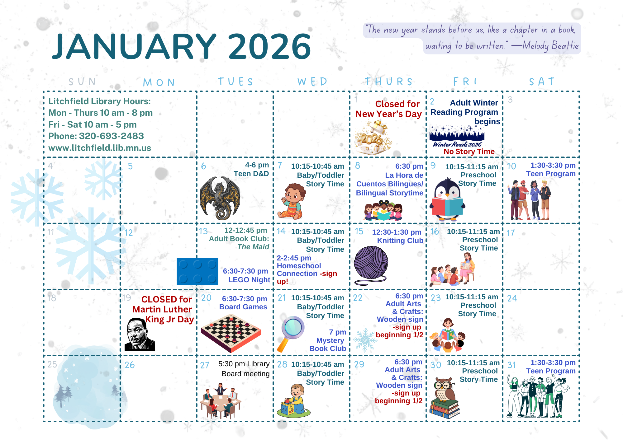 The Friends of the Litchfield Library are low on storage space for book donations. In December, please call ahead if you have more than 2 boxes or bags to bring: 320-693-2483. Thank you.